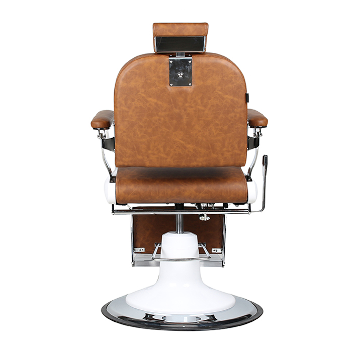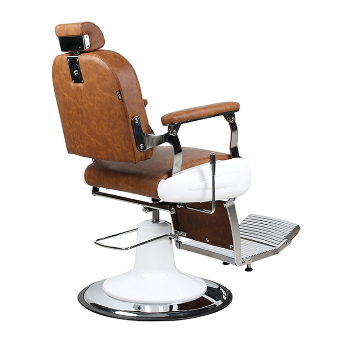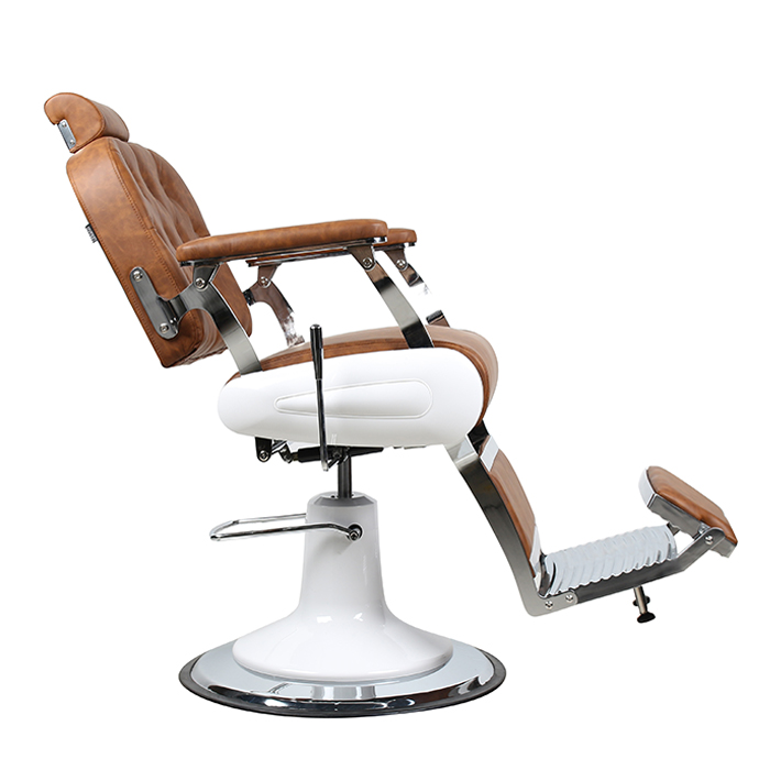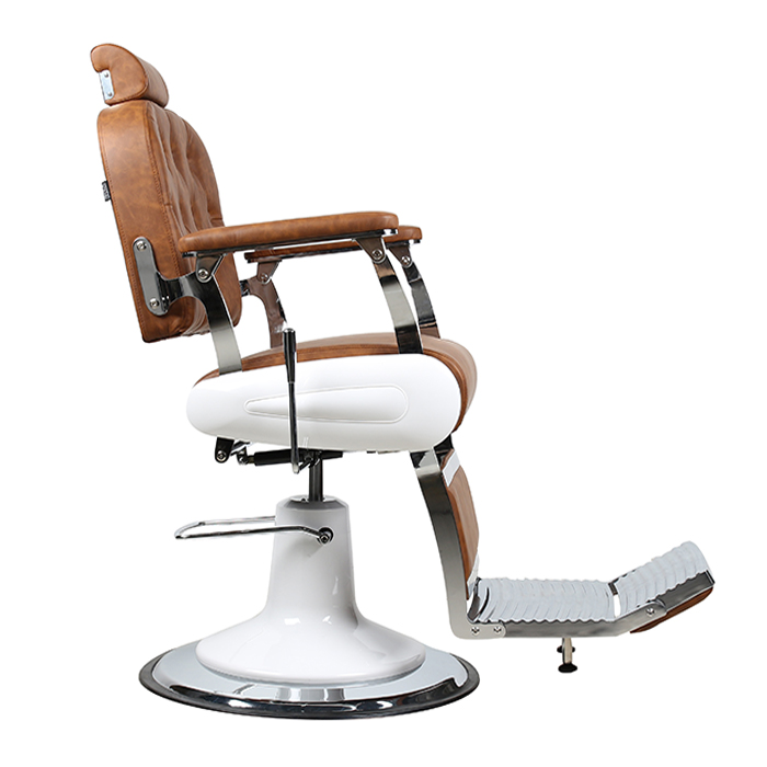 nThe Don Barber Chair takes vintage influence but also applied to today’s modern barber shops and salons, resulting in a delightfully contemporary take on the retro barber chair. It’s hand-crafted and created for supreme comfort in mind and is finished off with chrome arms with padded armrests and upholstered with tan coloured fire-retardant medical grade vinyl. The Don’s main feature is it luxurious buttoned tufted backrest.